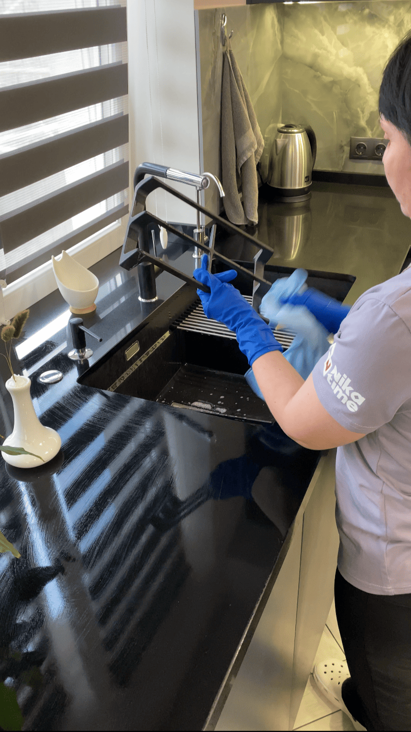 - Очищення кухні – раковини, стільниці, плити та холодильника. За допомогою спеціальних засобів професіонали без зусиль приберуть жир та інші, навіть сильні забруднення.